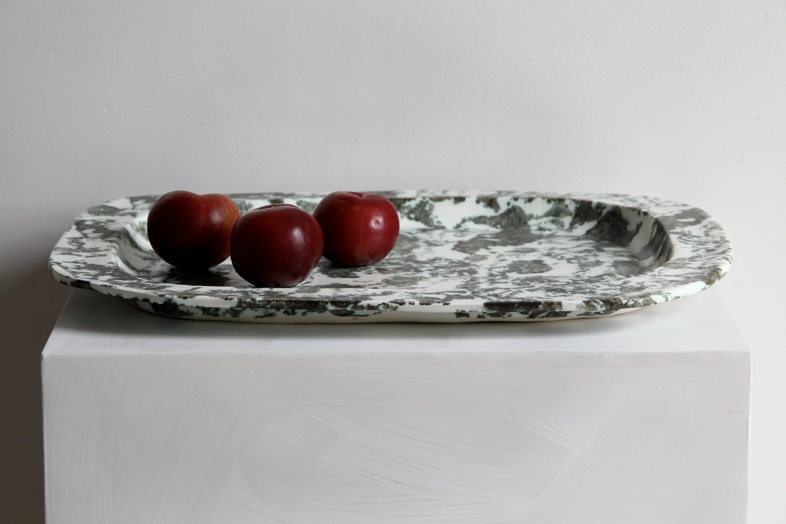 Bowl 62-92 › Lichen Platter Image 1 of 3 Image 2 of 3 Image 3 of 3 Lichen Platter $300.00 sold out Stoneware platter— handbuilt, with flared rim, glaze is inspired by patterns in lichen and magpie shells16” x 12” x 1 1/4” Get notified by email when this product is in stock. Sold Out Added! Stoneware platter— handbuilt, with flared rim, glaze is inspired by patterns in lichen and magpie shells16” x 12” x 1 1/4”