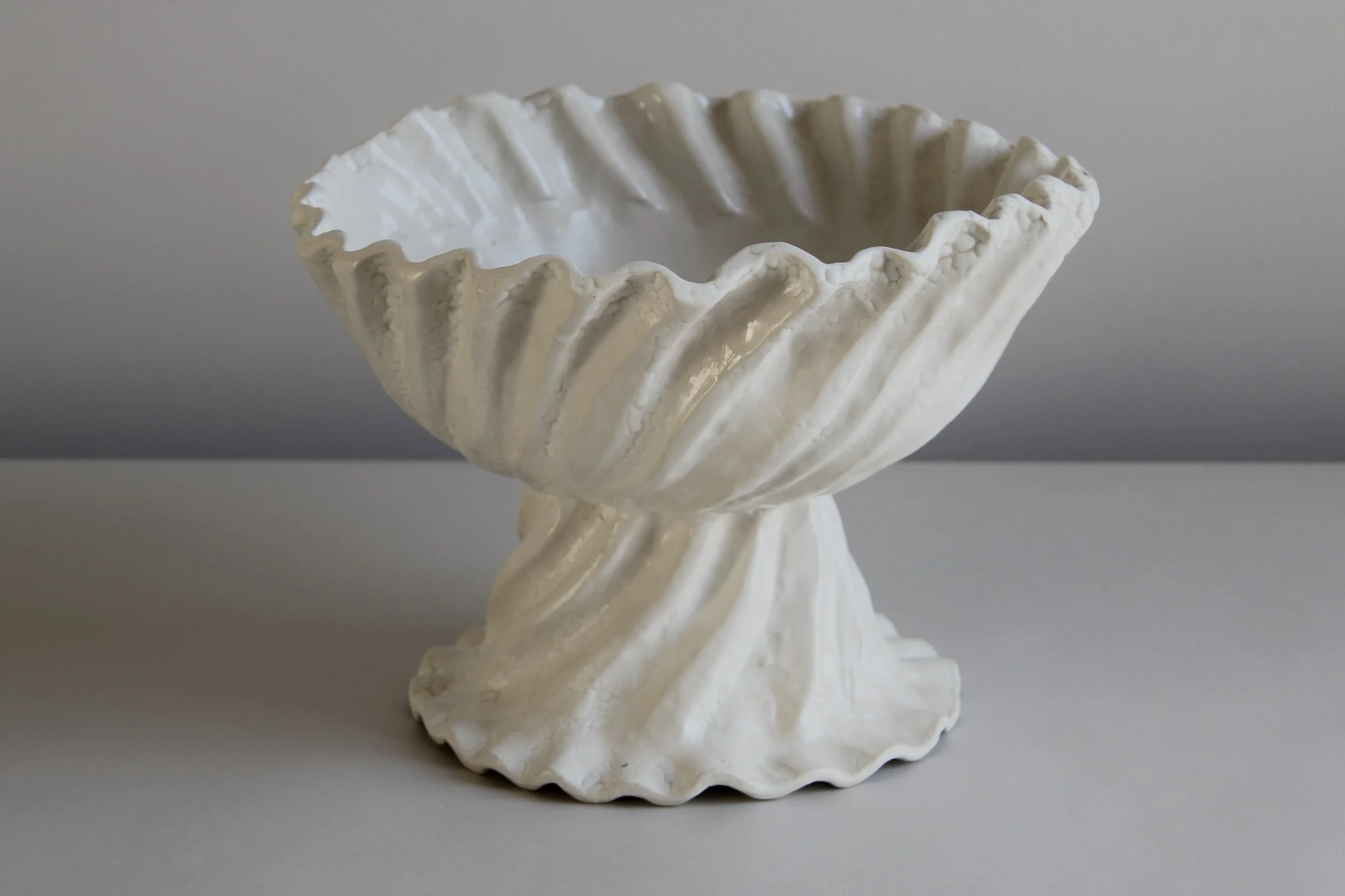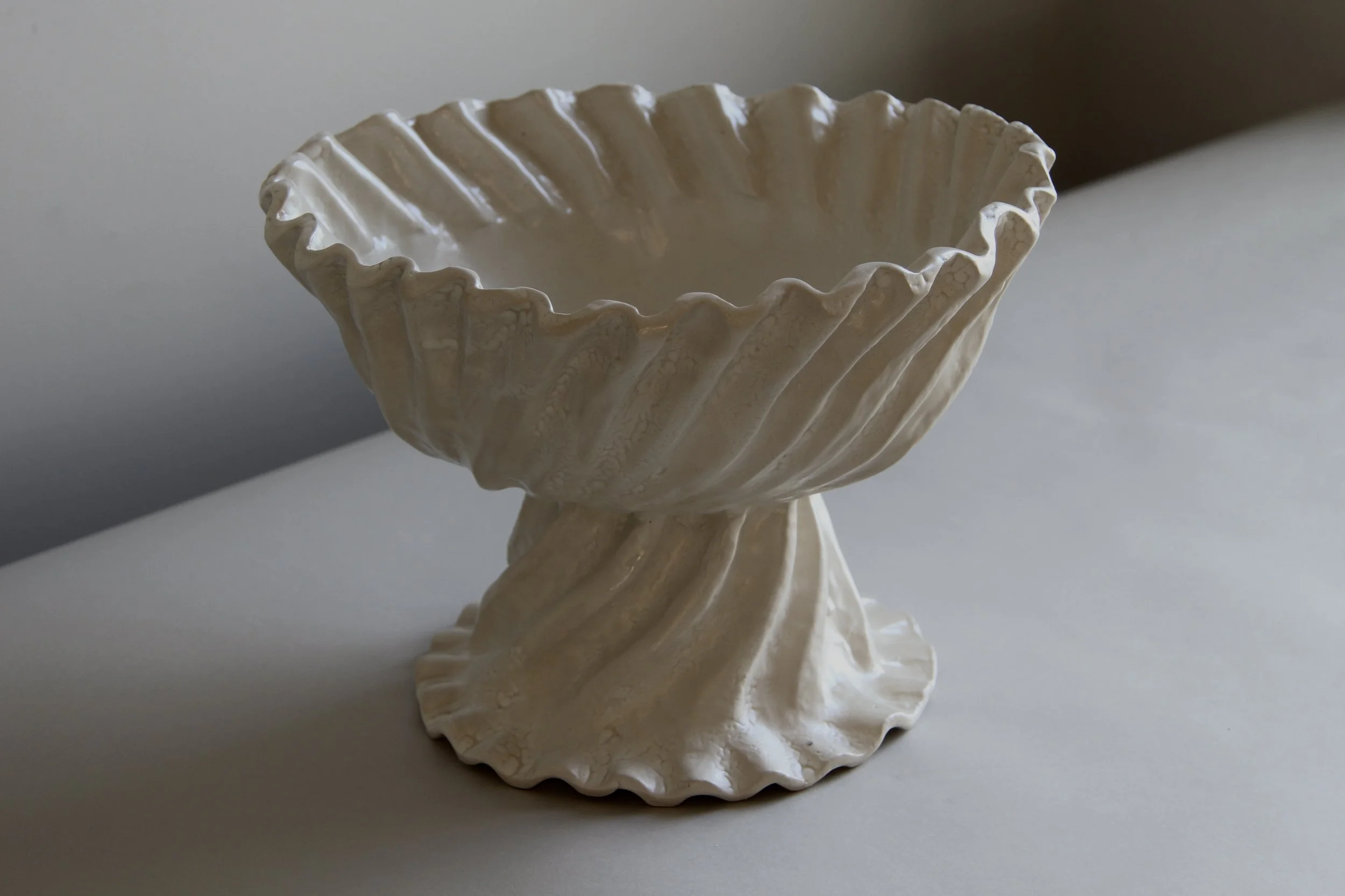 Unique Serving Pieces › Pedestal Bowl Image 1 of 3 Image 2 of 3 Image 3 of 3 Pedestal Bowl $250.00 sold out One of a kind handbuilt double pleated stoneware bowl with coral-textured creamy white glaze7” height, 10” width Get notified by email when this product is in stock. Sold Out Added! One of a kind handbuilt double pleated stoneware bowl with coral-textured creamy white glaze7” height, 10” width